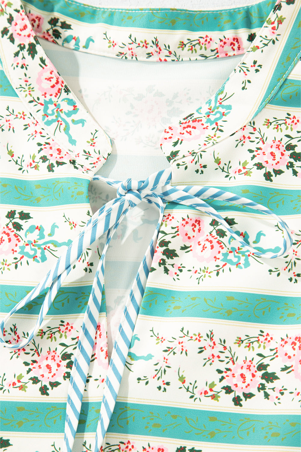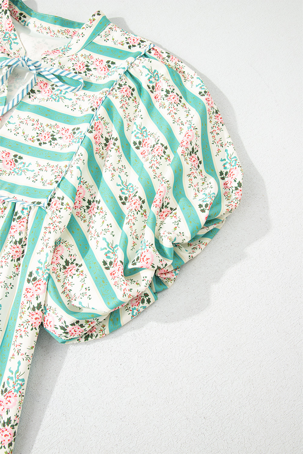 Multicolour Striped Floral Print Tie Split Neck Puff Sleeve Midi Dress